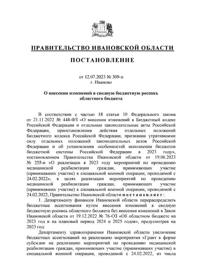 Постановление Правительства Ивановской области от 12.07.2023 N 309-п "О внесении изменений в сводную бюджетную роспись областного бюджета"