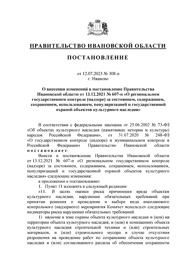 Постановление Правительства Ивановской области от 12.07.2023 N 308-п "О внесении изменений в постановление Правительства Ивановской области от 13.12.2021 N 607-п "О региональном государственном контроле (надзоре) за состоянием, содержанием, сохранением, использованием, популяризацией и государственной охраной объектов культурного наследия"