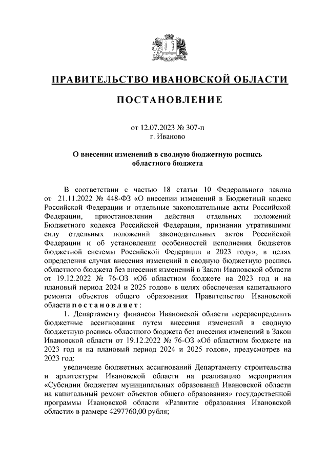 Постановление Правительства Ивановской области от 12.07.2023 N 307-п "О внесении изменений в сводную бюджетную роспись областного бюджета"