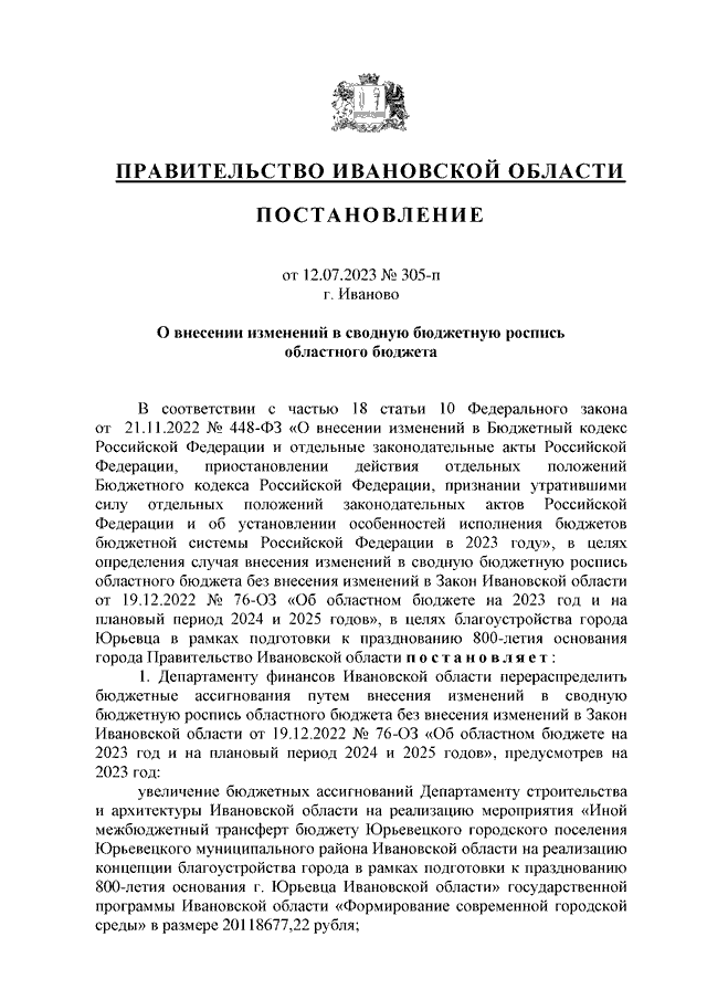 Постановление Правительства Ивановской области от 12.07.2023 N 305-п "О внесении изменений в сводную бюджетную роспись областного бюджета"
