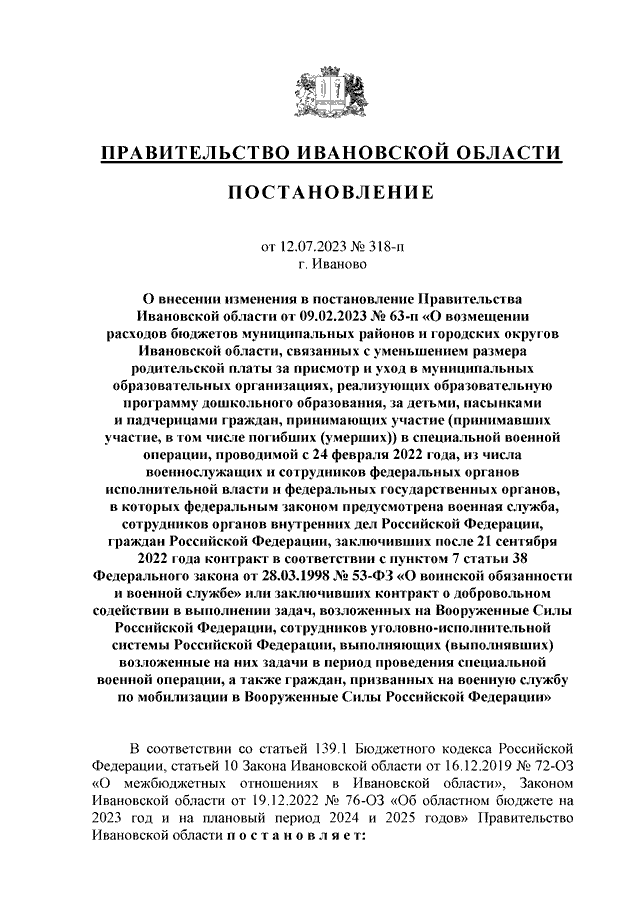 Постановление Правительства Ивановской области от 12.07.2023 N 318-п "О внесении изменения в постановление Правительства Ивановской области от 09.02.2023 N 63-п "О возмещении расходов бюджетов муниципальных районов и городских округов Ивановской области, связанных с уменьшением размера родительской платы за присмотр и уход в муниципальных образовательных организациях, реализующих образовательную программу дошкольного образования, за детьми, пасынками и падчерицами граждан, принимающих участие (принимавших участие, в том числе погибших (умерших)) в специальной военной операции, проводимой с 24 февраля 2022 года, из числа военнослужащих и сотрудников федеральных органов исполнительной власти и федеральных государственных органов, в которых федеральным законом предусмотрена военная служба, сотрудников органов внутренних дел Российской Федерации, граждан Российской Федерации, заключивших после 21 сентября 2022 года контракт в соответствии с пунктом 7 статьи 38 Федерального закона от 28.03.1998 N 53-ФЗ "О воинской обязанности и военной службе" или заключивших контракт о добровольном содействии в выполнении задач, возложенных на Вооруженные Силы Российской Федерации, сотрудников уголовно-исполнительной системы Российской Федерации, выполняющих (выполнявших) возложенные на них задачи в период проведения специальной военной операции, а также граждан, призванных на военную службу по мобилизации в Вооруженные Силы Российской Федерации" (вместе с "Методикой распределения и правилами предоставления из областного бюджета бюджетам муниципальных районов и городских округов Ивановской области иных межбюджетных трансфертов на возмещение расходов бюджетов муниципальных районов и городских округов Ивановской области, связанных с уменьшением размера родительской платы за присмотр и уход в муниципальных образовательных организациях, реализующих образовательную программу дошкольного образования, за детьми, пасынками и падчерицами граждан, принимающих участие (принимавших участие, в том числе погибших (умерших)) в специальной военной операции, проводимой с 24 февраля 2022 года, из числа военнослужащих и сотрудников федеральных органов исполнительной власти и федеральных государственных органов, в которых федеральным законом предусмотрена военная служба, сотрудников органов внутренних дел Российской Федерации, граждан Российской Федерации, заключивших после 21 сентября 2022 года контракт в соответствии с пунктом 7 статьи 38 Федерального закона от 28.03.1998 N 53-ФЗ "О воинской обязанности и военной службе" или заключивших контракт о добровольном содействии в выполнении задач, возложенных на Вооруженные Силы Российской Федерации, сотрудников уголовно-исполнительной системы Российской Федерации, выполняющих (выполнявших) возложенные на них задачи в период проведения специальной военной операции, а также граждан, призванных на военную службу по мобилизации в Вооруженные Силы Российской Федерации")