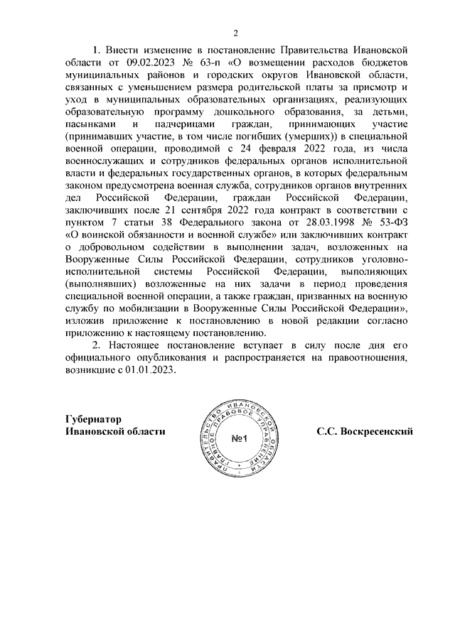 Постановление Правительства Ивановской области от 12.07.2023 N 318-п "О внесении изменения в постановление Правительства Ивановской области от 09.02.2023 N 63-п "О возмещении расходов бюджетов муниципальных районов и городских округов Ивановской области, связанных с уменьшением размера родительской платы за присмотр и уход в муниципальных образовательных организациях, реализующих образовательную программу дошкольного образования, за детьми, пасынками и падчерицами граждан, принимающих участие (принимавших участие, в том числе погибших (умерших)) в специальной военной операции, проводимой с 24 февраля 2022 года, из числа военнослужащих и сотрудников федеральных органов исполнительной власти и федеральных государственных органов, в которых федеральным законом предусмотрена военная служба, сотрудников органов внутренних дел Российской Федерации, граждан Российской Федерации, заключивших после 21 сентября 2022 года контракт в соответствии с пунктом 7 статьи 38 Федерального закона от 28.03.1998 N 53-ФЗ "О воинской обязанности и военной службе" или заключивших контракт о добровольном содействии в выполнении задач, возложенных на Вооруженные Силы Российской Федерации, сотрудников уголовно-исполнительной системы Российской Федерации, выполняющих (выполнявших) возложенные на них задачи в период проведения специальной военной операции, а также граждан, призванных на военную службу по мобилизации в Вооруженные Силы Российской Федерации" (вместе с "Методикой распределения и правилами предоставления из областного бюджета бюджетам муниципальных районов и городских округов Ивановской области иных межбюджетных трансфертов на возмещение расходов бюджетов муниципальных районов и городских округов Ивановской области, связанных с уменьшением размера родительской платы за присмотр и уход в муниципальных образовательных организациях, реализующих образовательную программу дошкольного образования, за детьми, пасынками и падчерицами граждан, принимающих участие (принимавших участие, в том числе погибших (умерших)) в специальной военной операции, проводимой с 24 февраля 2022 года, из числа военнослужащих и сотрудников федеральных органов исполнительной власти и федеральных государственных органов, в которых федеральным законом предусмотрена военная служба, сотрудников органов внутренних дел Российской Федерации, граждан Российской Федерации, заключивших после 21 сентября 2022 года контракт в соответствии с пунктом 7 статьи 38 Федерального закона от 28.03.1998 N 53-ФЗ "О воинской обязанности и военной службе" или заключивших контракт о добровольном содействии в выполнении задач, возложенных на Вооруженные Силы Российской Федерации, сотрудников уголовно-исполнительной системы Российской Федерации, выполняющих (выполнявших) возложенные на них задачи в период проведения специальной военной операции, а также граждан, призванных на военную службу по мобилизации в Вооруженные Силы Российской Федерации")