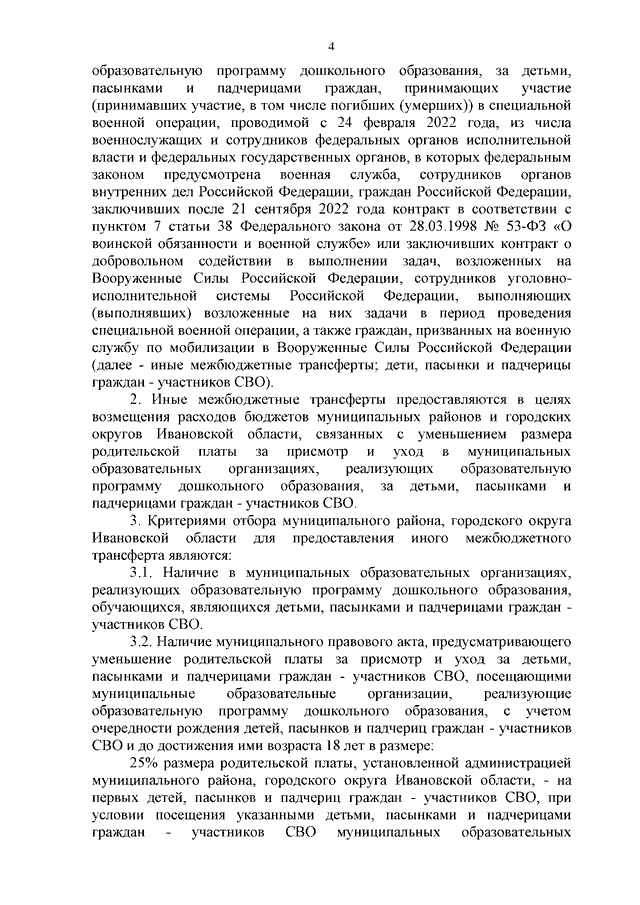 Постановление Правительства Ивановской области от 12.07.2023 N 318-п "О внесении изменения в постановление Правительства Ивановской области от 09.02.2023 N 63-п "О возмещении расходов бюджетов муниципальных районов и городских округов Ивановской области, связанных с уменьшением размера родительской платы за присмотр и уход в муниципальных образовательных организациях, реализующих образовательную программу дошкольного образования, за детьми, пасынками и падчерицами граждан, принимающих участие (принимавших участие, в том числе погибших (умерших)) в специальной военной операции, проводимой с 24 февраля 2022 года, из числа военнослужащих и сотрудников федеральных органов исполнительной власти и федеральных государственных органов, в которых федеральным законом предусмотрена военная служба, сотрудников органов внутренних дел Российской Федерации, граждан Российской Федерации, заключивших после 21 сентября 2022 года контракт в соответствии с пунктом 7 статьи 38 Федерального закона от 28.03.1998 N 53-ФЗ "О воинской обязанности и военной службе" или заключивших контракт о добровольном содействии в выполнении задач, возложенных на Вооруженные Силы Российской Федерации, сотрудников уголовно-исполнительной системы Российской Федерации, выполняющих (выполнявших) возложенные на них задачи в период проведения специальной военной операции, а также граждан, призванных на военную службу по мобилизации в Вооруженные Силы Российской Федерации" (вместе с "Методикой распределения и правилами предоставления из областного бюджета бюджетам муниципальных районов и городских округов Ивановской области иных межбюджетных трансфертов на возмещение расходов бюджетов муниципальных районов и городских округов Ивановской области, связанных с уменьшением размера родительской платы за присмотр и уход в муниципальных образовательных организациях, реализующих образовательную программу дошкольного образования, за детьми, пасынками и падчерицами граждан, принимающих участие (принимавших участие, в том числе погибших (умерших)) в специальной военной операции, проводимой с 24 февраля 2022 года, из числа военнослужащих и сотрудников федеральных органов исполнительной власти и федеральных государственных органов, в которых федеральным законом предусмотрена военная служба, сотрудников органов внутренних дел Российской Федерации, граждан Российской Федерации, заключивших после 21 сентября 2022 года контракт в соответствии с пунктом 7 статьи 38 Федерального закона от 28.03.1998 N 53-ФЗ "О воинской обязанности и военной службе" или заключивших контракт о добровольном содействии в выполнении задач, возложенных на Вооруженные Силы Российской Федерации, сотрудников уголовно-исполнительной системы Российской Федерации, выполняющих (выполнявших) возложенные на них задачи в период проведения специальной военной операции, а также граждан, призванных на военную службу по мобилизации в Вооруженные Силы Российской Федерации")
