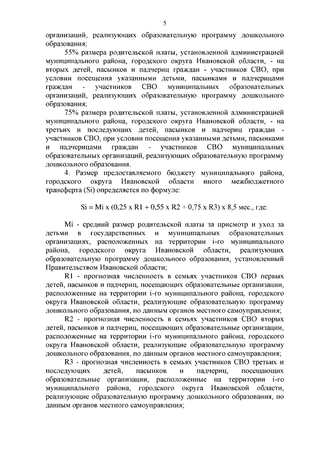 Постановление Правительства Ивановской области от 12.07.2023 N 318-п "О внесении изменения в постановление Правительства Ивановской области от 09.02.2023 N 63-п "О возмещении расходов бюджетов муниципальных районов и городских округов Ивановской области, связанных с уменьшением размера родительской платы за присмотр и уход в муниципальных образовательных организациях, реализующих образовательную программу дошкольного образования, за детьми, пасынками и падчерицами граждан, принимающих участие (принимавших участие, в том числе погибших (умерших)) в специальной военной операции, проводимой с 24 февраля 2022 года, из числа военнослужащих и сотрудников федеральных органов исполнительной власти и федеральных государственных органов, в которых федеральным законом предусмотрена военная служба, сотрудников органов внутренних дел Российской Федерации, граждан Российской Федерации, заключивших после 21 сентября 2022 года контракт в соответствии с пунктом 7 статьи 38 Федерального закона от 28.03.1998 N 53-ФЗ "О воинской обязанности и военной службе" или заключивших контракт о добровольном содействии в выполнении задач, возложенных на Вооруженные Силы Российской Федерации, сотрудников уголовно-исполнительной системы Российской Федерации, выполняющих (выполнявших) возложенные на них задачи в период проведения специальной военной операции, а также граждан, призванных на военную службу по мобилизации в Вооруженные Силы Российской Федерации" (вместе с "Методикой распределения и правилами предоставления из областного бюджета бюджетам муниципальных районов и городских округов Ивановской области иных межбюджетных трансфертов на возмещение расходов бюджетов муниципальных районов и городских округов Ивановской области, связанных с уменьшением размера родительской платы за присмотр и уход в муниципальных образовательных организациях, реализующих образовательную программу дошкольного образования, за детьми, пасынками и падчерицами граждан, принимающих участие (принимавших участие, в том числе погибших (умерших)) в специальной военной операции, проводимой с 24 февраля 2022 года, из числа военнослужащих и сотрудников федеральных органов исполнительной власти и федеральных государственных органов, в которых федеральным законом предусмотрена военная служба, сотрудников органов внутренних дел Российской Федерации, граждан Российской Федерации, заключивших после 21 сентября 2022 года контракт в соответствии с пунктом 7 статьи 38 Федерального закона от 28.03.1998 N 53-ФЗ "О воинской обязанности и военной службе" или заключивших контракт о добровольном содействии в выполнении задач, возложенных на Вооруженные Силы Российской Федерации, сотрудников уголовно-исполнительной системы Российской Федерации, выполняющих (выполнявших) возложенные на них задачи в период проведения специальной военной операции, а также граждан, призванных на военную службу по мобилизации в Вооруженные Силы Российской Федерации")
