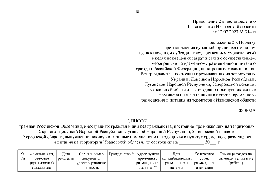 Постановление Правительства Ивановской области от 12.07.2023 N 314-п "О внесении изменений в постановление Правительства Ивановской области от 21.09.2022 N 515-п "Об утверждении Порядка предоставления субсидий юридическим лицам (за исключением субсидий государственным учреждениям) в целях возмещения затрат в связи с осуществлением мероприятий по временному размещению и питанию граждан Российской Федерации, иностранных граждан и лиц без гражданства, постоянно проживающих на территориях Украины, Донецкой Народной Республики, Луганской Народной Республики, вынужденно покинувших территории Украины, Донецкой Народной Республики и Луганской Народной Республики, прибывших на территорию Российской Федерации в экстренном массовом порядке и находящихся в пунктах временного размещения и питания на территории Ивановской области"