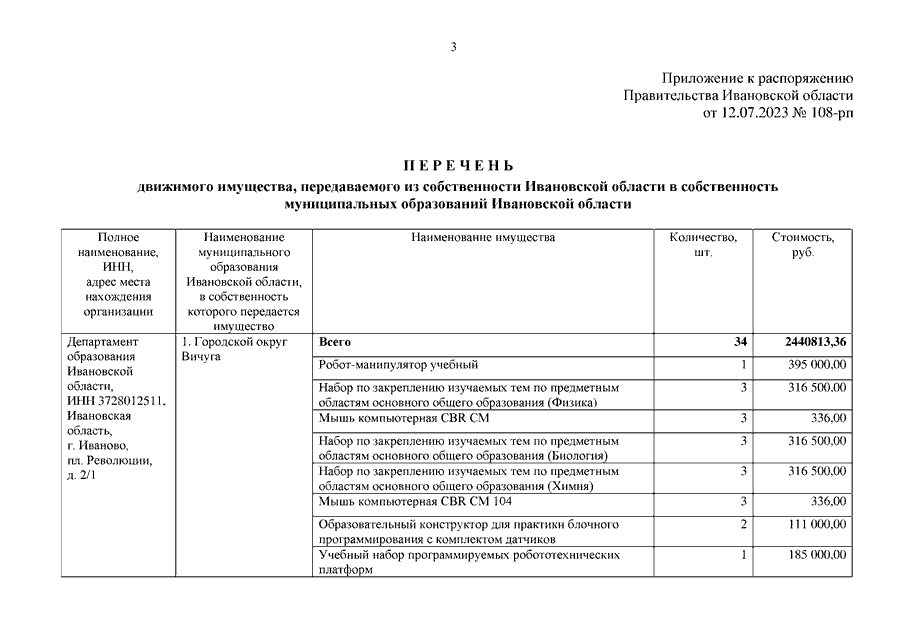 Распоряжение Правительства Ивановской области от 12.07.2023 N 108-рп "О передаче движимого имущества из собственности Ивановской области в собственность муниципальных образований Ивановской области"