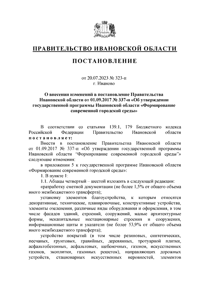 Постановление Правительства Ивановской области от 20.07.2023 N 323-п "О внесении изменений в постановление Правительства Ивановской области от 01.09.2017 N 337-п "Об утверждении государственной программы Ивановской области "Формирование современной городской среды"