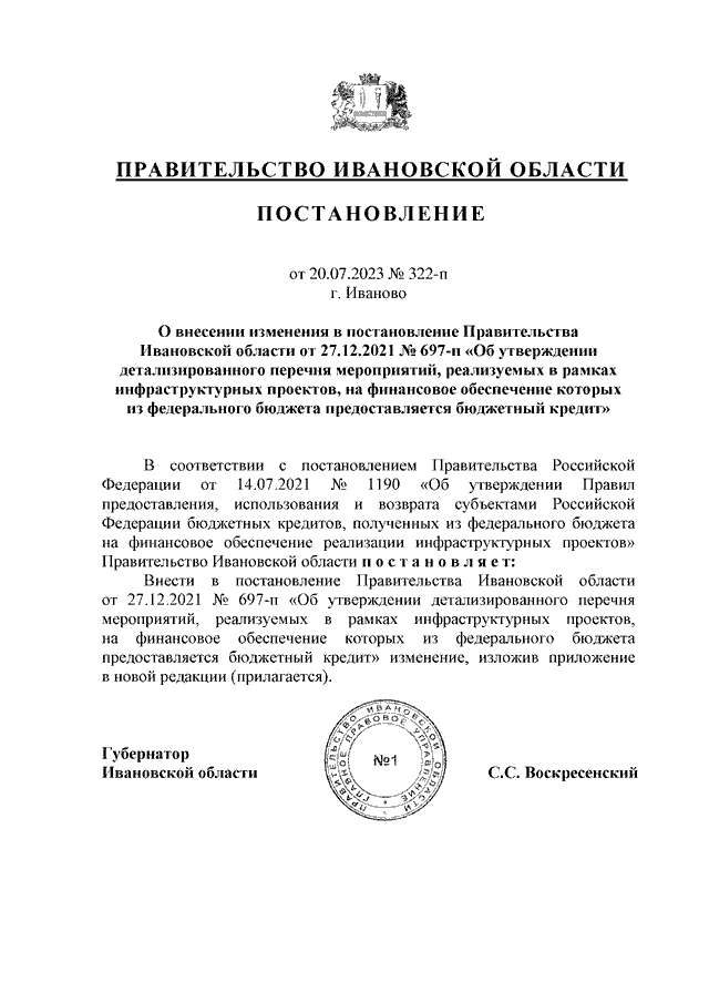 Постановление Правительства Ивановской области от 20.07.2023 N 322-п "О внесении изменения в постановление Правительства Ивановской области от 27.12.2021 N 697-п "Об утверждении детализированного перечня мероприятий, реализуемых в рамках инфраструктурных проектов, на финансовое обеспечение которых из федерального бюджета предоставляется бюджетный кредит"