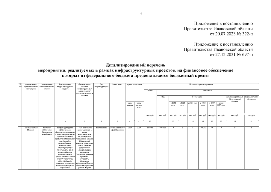 Постановление Правительства Ивановской области от 20.07.2023 N 322-п "О внесении изменения в постановление Правительства Ивановской области от 27.12.2021 N 697-п "Об утверждении детализированного перечня мероприятий, реализуемых в рамках инфраструктурных проектов, на финансовое обеспечение которых из федерального бюджета предоставляется бюджетный кредит"