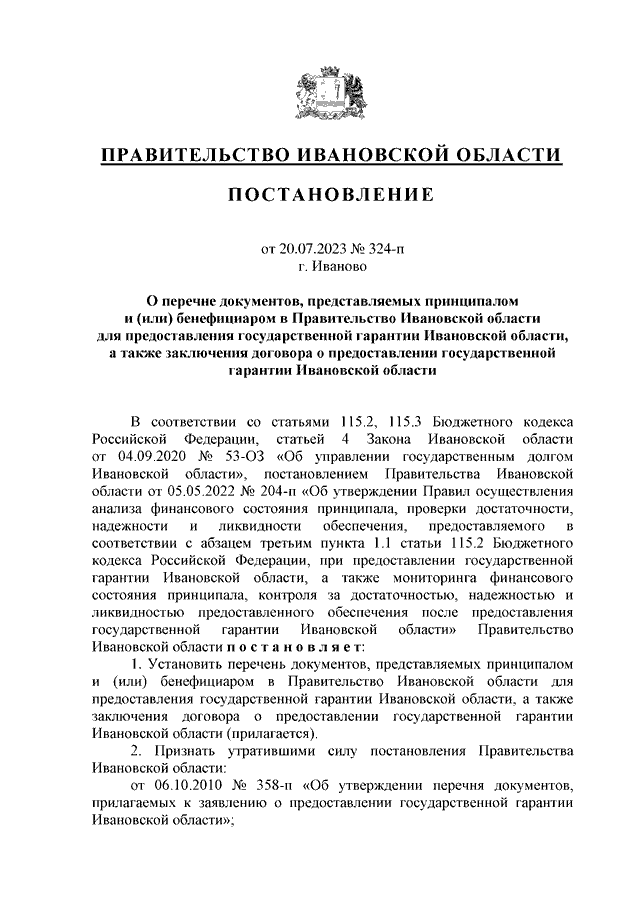 Постановление Правительства Ивановской области от 20.07.2023 N 324-п "О перечне документов, представляемых принципалом и (или) бенефициаром в Правительство Ивановской области для предоставления государственной гарантии Ивановской области, а также заключения договора о предоставлении государственной гарантии Ивановской области"