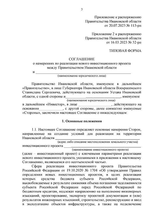 Распоряжение Правительства Ивановской области от 20.07.2023 N 113-рп "О внесении изменений в распоряжение Правительства Ивановской области от 16.03.2023 N 32-рп "О мерах по реализации постановления Правительства Российской Федерации от 19.10.2020 N 1704 "Об утверждении Правил определения новых инвестиционных проектов, в целях реализации которых средства бюджета субъекта Российской Федерации, высвобождаемые в результате снижения объема погашения задолженности субъекта Российской Федерации перед Российской Федерацией по бюджетным кредитам, подлежат направлению на выполнение инженерных изысканий, проектирование, экспертизу проектной документации и (или) результатов инженерных изысканий, строительство, реконструкцию и ввод в эксплуатацию объектов инфраструктуры, а также на подключение (технологическое присоединение) объектов капитального строительства к сетям инженерно-технического обеспечения"