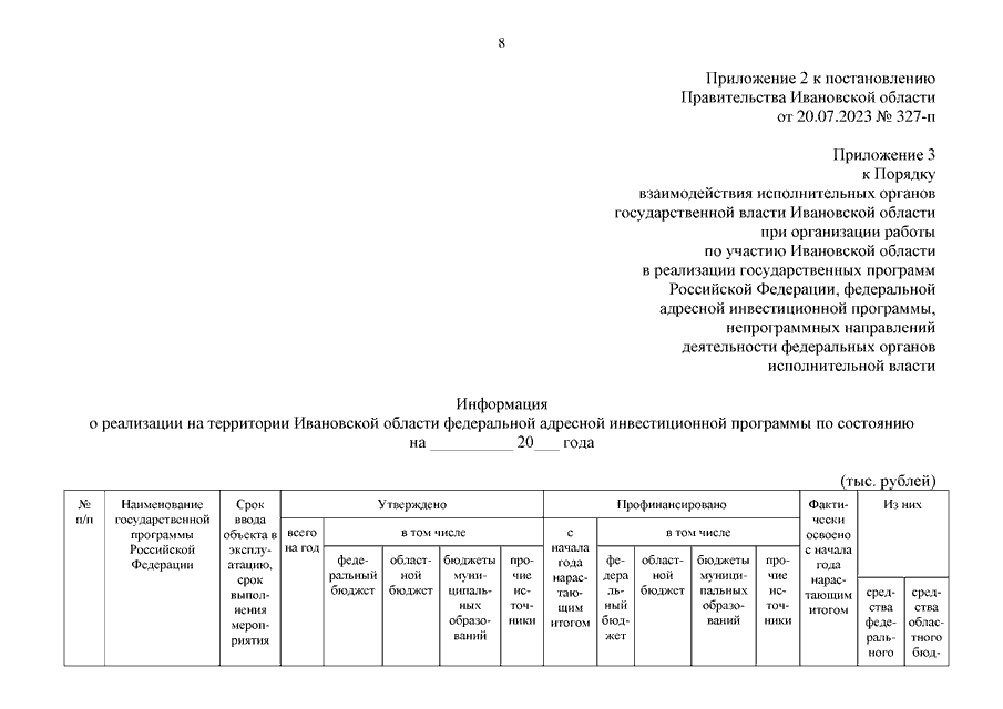 Постановление Правительства Ивановской области от 20.07.2023 N 327-п "О внесении изменений в постановление Правительства Ивановской области от 17.05.2017 N 188-п "Об утверждении Порядка взаимодействия исполнительных органов государственной власти Ивановской области при организации работы по участию Ивановской области в реализации государственных программ Российской Федерации, федеральной адресной инвестиционной программы, непрограммных направлений деятельности федеральных органов исполнительной власти"