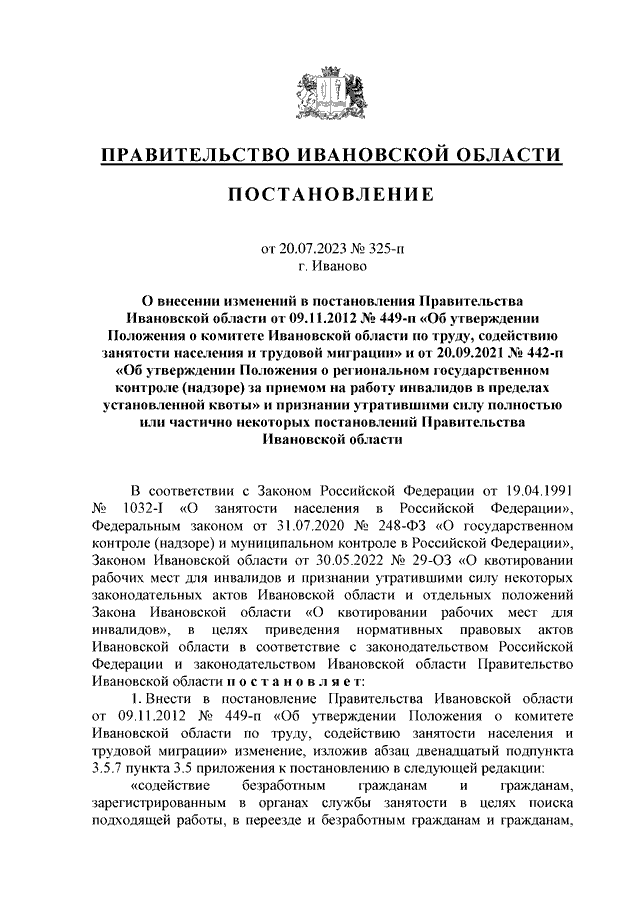 Постановление Правительства Ивановской области от 20.07.2023 N 325-п "О внесении изменений в постановления Правительства Ивановской области от 09.11.2012 N 449-п "Об утверждении Положения о комитете Ивановской области по труду, содействию занятости населения и трудовой миграции" и от 20.09.2021 N 442-п "Об утверждении Положения о региональном государственном контроле (надзоре) за приемом на работу инвалидов в пределах установленной квоты" и признании утратившими силу полностью или частично некоторых постановлений Правительства Ивановской области"