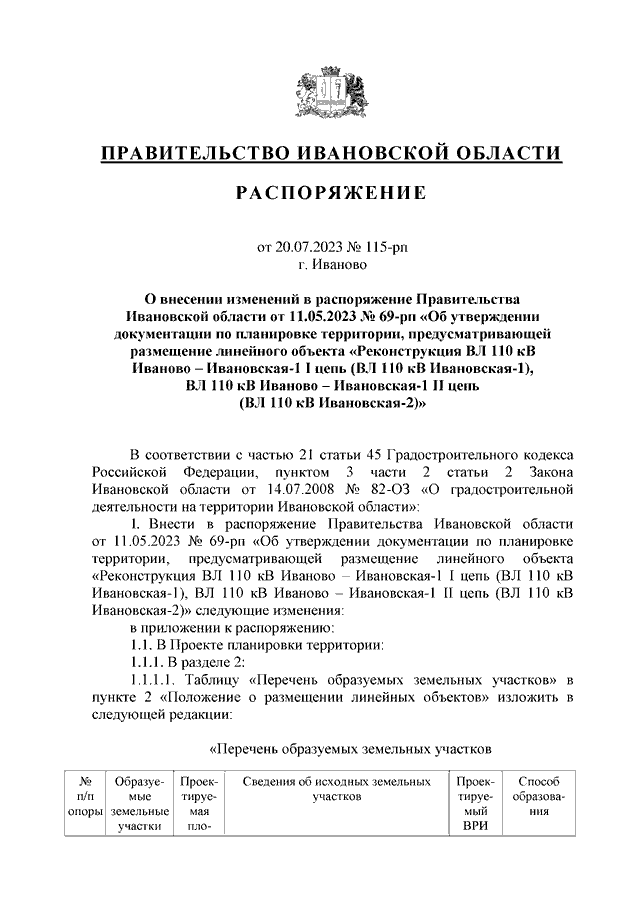 Распоряжение Правительства Ивановской области от 20.07.2023 N 115-рп "О внесении изменений в распоряжение Правительства Ивановской области от 11.05.2023 N 69-рп "Об утверждении документации по планировке территории, предусматривающей размещение линейного объекта "Реконструкция ВЛ 110 кВ Иваново - Ивановская-1 I цепь (ВЛ 110 кВ Ивановская-1), ВЛ 110 кВ Иваново - Ивановская-1 II цепь (ВЛ 110 кВ Ивановская-2)"