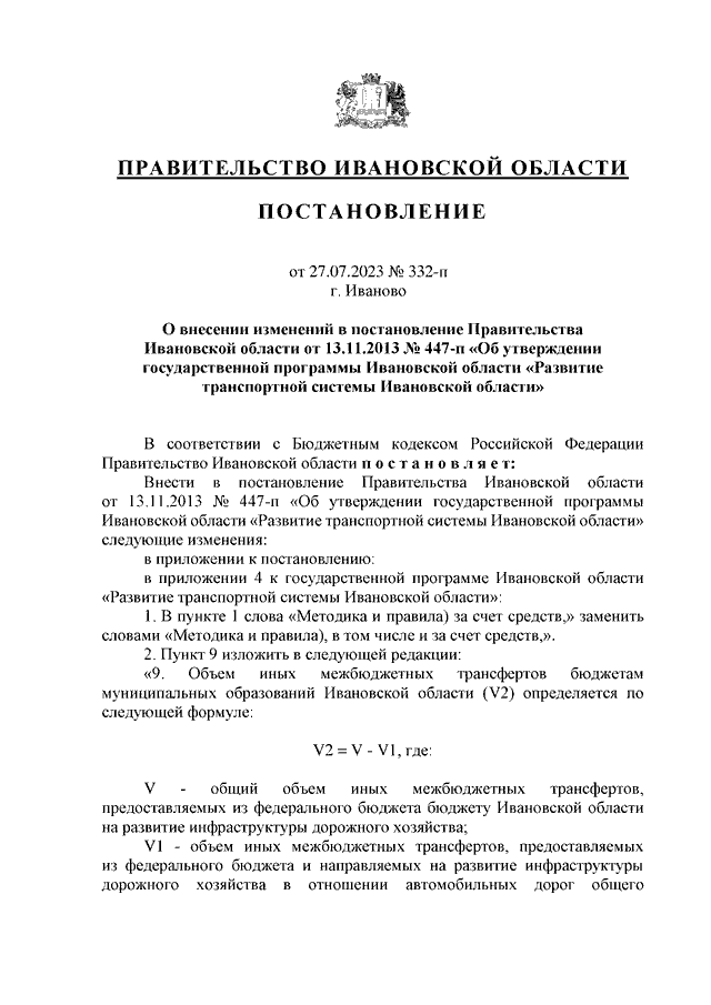 Постановление Правительства Ивановской области от 27.07.2023 N 332-п "О внесении изменений в постановление Правительства Ивановской области от 13.11.2013 N 447-п "Об утверждении государственной программы Ивановской области "Развитие транспортной системы Ивановской области"
