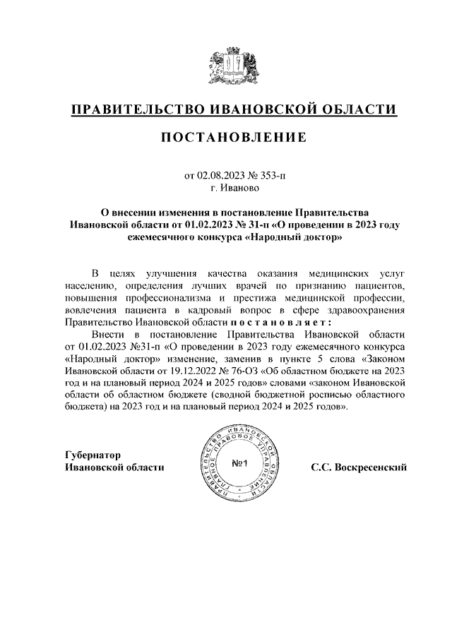 Постановление Правительства Ивановской области от 02.08.2023 N 353-п "О внесении изменения в постановление Правительства Ивановской области от 01.02.2023 N 31-п "О проведении в 2023 году ежемесячного конкурса "Народный доктор"