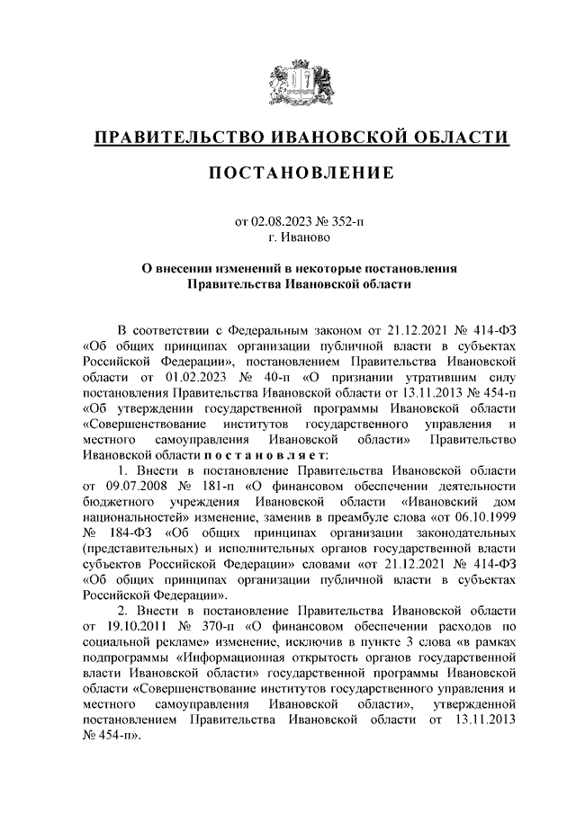 Постановление Правительства Ивановской области от 02.08.2023 N 352-п "О внесении изменений в некоторые постановления Правительства Ивановской области"