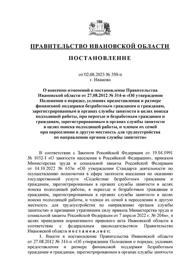 Постановление Правительства Ивановской области от 02.08.2023 N 350-п "О внесении изменений в постановление Правительства Ивановской области от 27.08.2012 N 314-п "Об утверждении Положения о порядке, условиях предоставления и размере финансовой поддержки безработным гражданам и гражданам, зарегистрированным в органах службы занятости в целях поиска подходящей работы, при переезде и безработным гражданам и гражданам, зарегистрированным в органах службы занятости в целях поиска подходящей работы, и членам их семей при переселении в другую местность для трудоустройства по направлению органов службы занятости"