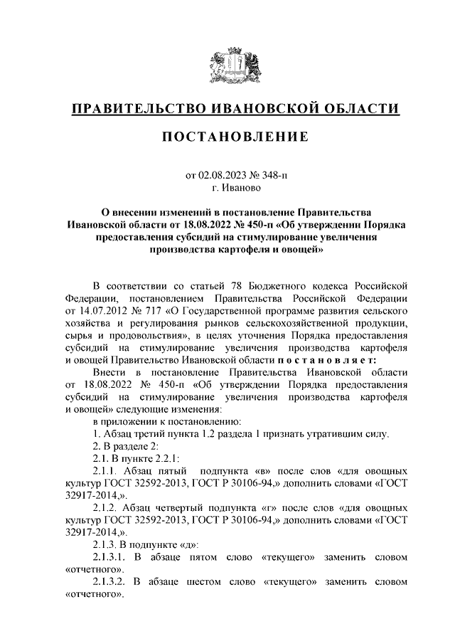 Постановление Правительства Ивановской области от 02.08.2023 N 348-п "О внесении изменений в постановление Правительства Ивановской области от 18.08.2022 N 450-п "Об утверждении Порядка предоставления субсидий на стимулирование увеличения производства картофеля и овощей"