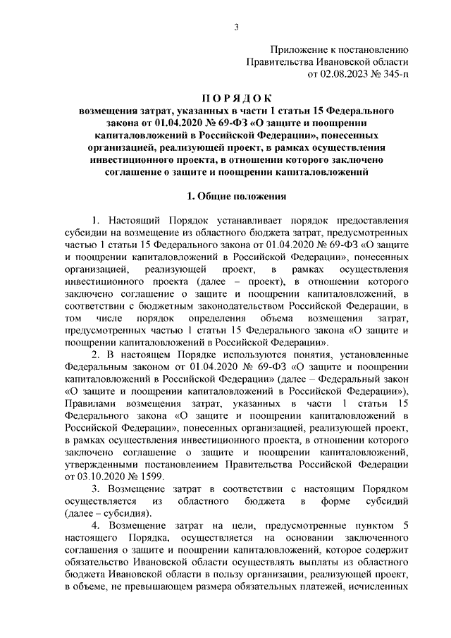 Постановление Правительства Ивановской области от 02.08.2023 N 345-п "Об утверждении Порядка возмещения затрат, указанных в части 1 статьи 15 Федерального закона от 01.04.2020 N 69-ФЗ "О защите и поощрении капиталовложений в Российской Федерации", понесенных организацией, реализующей проект, в рамках осуществления инвестиционного проекта, в отношении которого заключено соглашение о защите и поощрении капиталовложений"