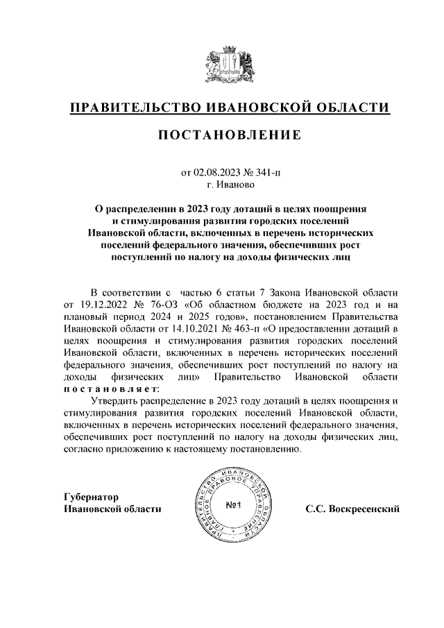 Постановление Правительства Ивановской области от 02.08.2023 N 341-п "О распределении в 2023 году дотаций в целях поощрения и стимулирования развития городских поселений Ивановской области, включенных в перечень исторических поселений федерального значения, обеспечивших рост поступлений по налогу на доходы физических лиц"