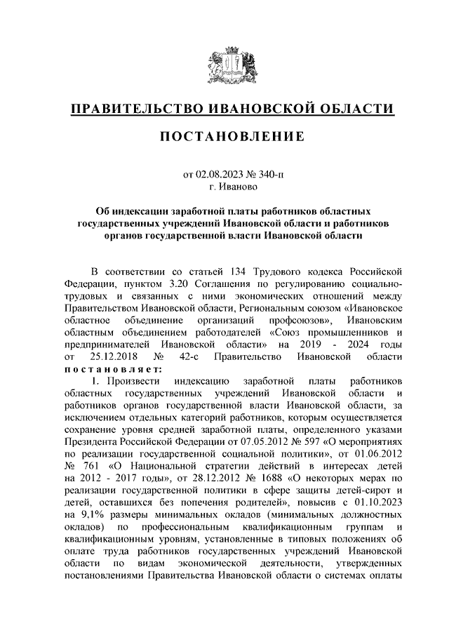 Постановление Правительства Ивановской области от 02.08.2023 N 340-п "Об индексации заработной платы работников областных государственных учреждений Ивановской области и работников органов государственной власти Ивановской области"