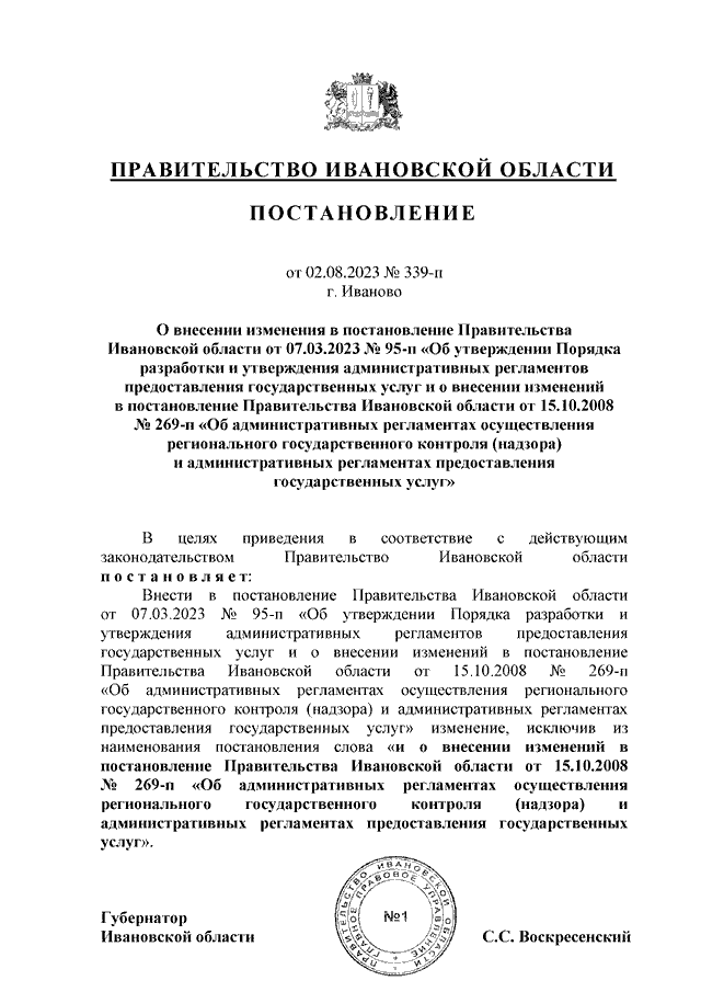 Постановление Правительства Ивановской области от 02.08.2023 N 339-п "О внесении изменения в постановление Правительства Ивановской области от 07.03.2023 N 95-п "Об утверждении Порядка разработки и утверждения административных регламентов предоставления государственных услуг и о внесении изменений в постановление Правительства Ивановской области от 15.10.2008 N 269-п "Об административных регламентах осуществления регионального государственного контроля (надзора) и административных регламентах предоставления государственных услуг"