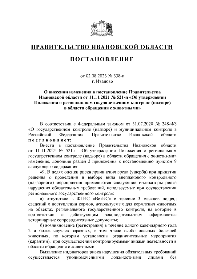 Постановление Правительства Ивановской области от 02.08.2023 N 338-п "О внесении изменения в постановление Правительства Ивановской области от 11.11.2021 N 521-п "Об утверждении Положения о региональном государственном контроле (надзоре) в области обращения с животными"