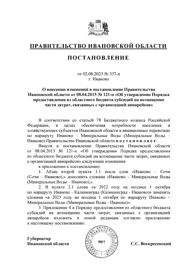 Постановление Правительства Ивановской области от 02.08.2023 N 337-п "О внесении изменений в постановление Правительства Ивановской области от 08.04.2015 N 121-п "Об утверждении Порядка предоставления из областного бюджета субсидий на возмещение части затрат, связанных с организацией авиарейсов" (вместе с "Перечнем субсидируемых маршрутов и предельным размером субсидии, предоставляемой организации воздушного транспорта на один рейс в одном направлении")
