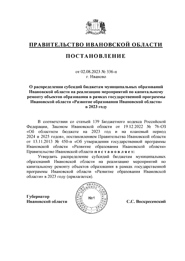 Постановление Правительства Ивановской области от 02.08.2023 N 336-п "О распределении субсидий бюджетам муниципальных образований Ивановской области на реализацию мероприятий по капитальному ремонту объектов образования в рамках государственной программы Ивановской области "Развитие образования Ивановской области" в 2023 году"