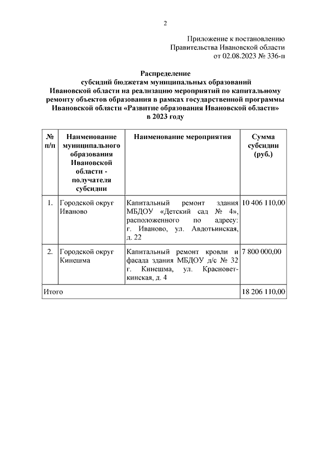 Постановление Правительства Ивановской области от 02.08.2023 N 336-п "О распределении субсидий бюджетам муниципальных образований Ивановской области на реализацию мероприятий по капитальному ремонту объектов образования в рамках государственной программы Ивановской области "Развитие образования Ивановской области" в 2023 году"