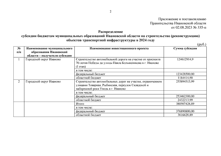 Постановление Правительства Ивановской области от 02.08.2023 N 335-п "О распределении субсидии бюджетам муниципальных образований Ивановской области на строительство (реконструкцию) объектов транспортной инфраструктуры в 2024 году"