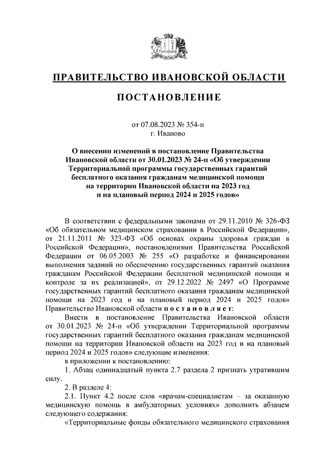 Постановление Правительства Ивановской области от 07.08.2023 N 354-п "О внесении изменений в постановление Правительства Ивановской области от 30.01.2023 N 24-п "Об утверждении Территориальной программы государственных гарантий бесплатного оказания гражданам медицинской помощи на территории Ивановской области на 2023 год и на плановый период 2024 и 2025 годов" (вместе с "Перечнем медицинских организаций, осуществляющих деятельность по медицинской реабилитации")