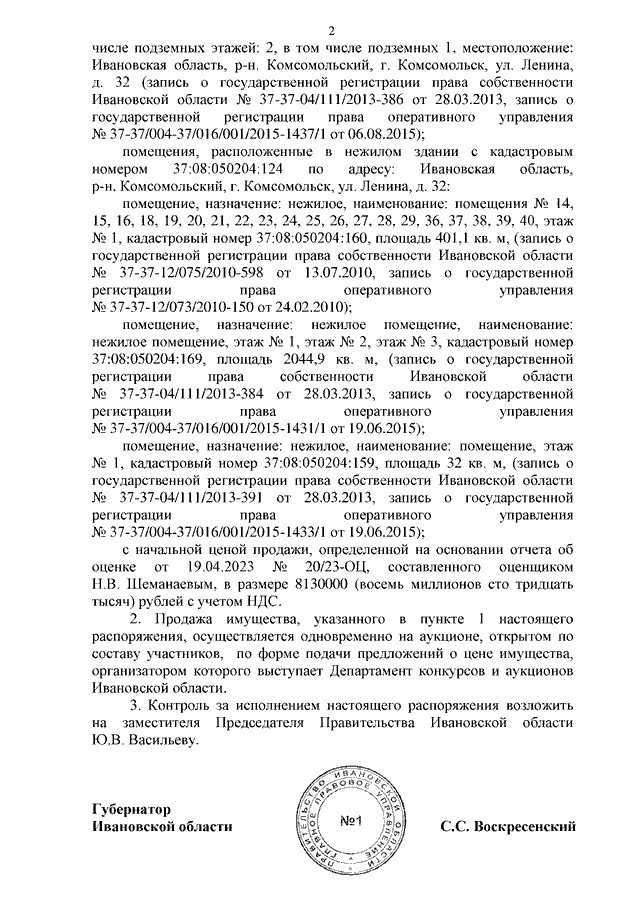 Распоряжение Правительства Ивановской области от 07.08.2023 N 128-рп "О продаже имущества, находящегося в собственности Ивановской области, закрепленного на праве оперативного управления за бюджетным учреждением социального обслуживания Ивановской области "Комсомольский центр социального обслуживания"