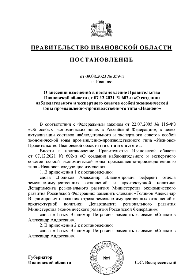 Постановление Правительства Ивановской области от 09.08.2023 N 359-п "О внесении изменений в постановление Правительства Ивановской области от 07.12.2021 N 602-п "О создании наблюдательного и экспертного советов особой экономической зоны промышленно-производственного типа "Иваново"