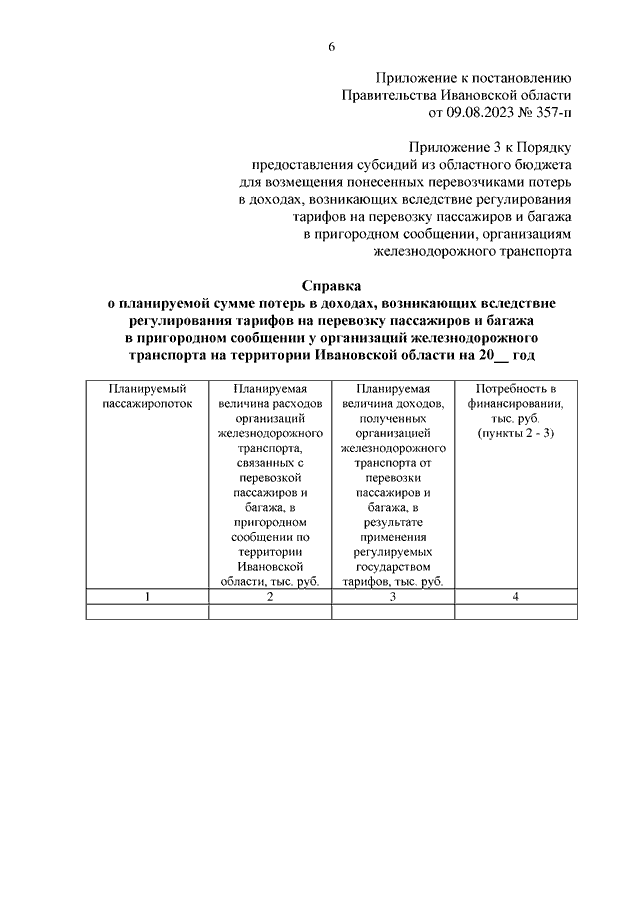 Постановление Правительства Ивановской области от 09.08.2023 N 357-п "О внесении изменений в постановление Правительства Ивановской области от 08.10.2018 N 287-п "Об утверждении Порядка предоставления субсидий из областного бюджета для возмещения понесенных перевозчиками потерь в доходах, возникающих вследствие регулирования тарифов на перевозку пассажиров и багажа в пригородном сообщении, организациям железнодорожного транспорта"
