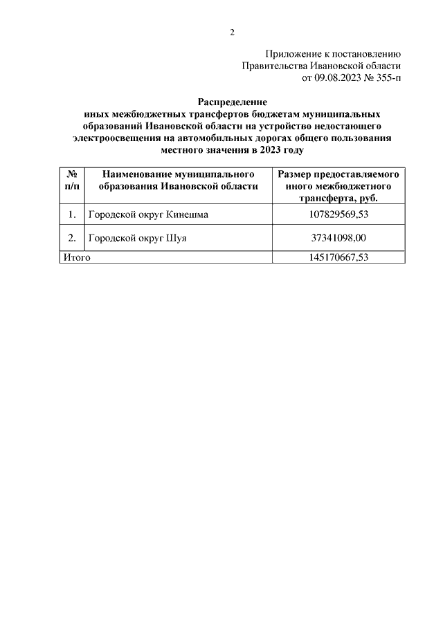 Постановление Правительства Ивановской области от 09.08.2023 N 355-п "О распределении иных межбюджетных трансфертов бюджетам муниципальных образований Ивановской области на устройство недостающего электроосвещения на автомобильных дорогах общего пользования местного значения в 2023 году"