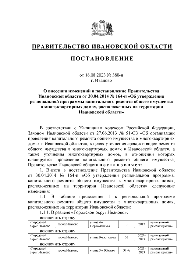 Постановление Правительства Ивановской области от 18.08.2023 N 380-п "О внесении изменений в постановление Правительства Ивановской области от 30.04.2014 N 164-п "Об утверждении региональной программы капитального ремонта общего имущества в многоквартирных домах, расположенных на территории Ивановской области"