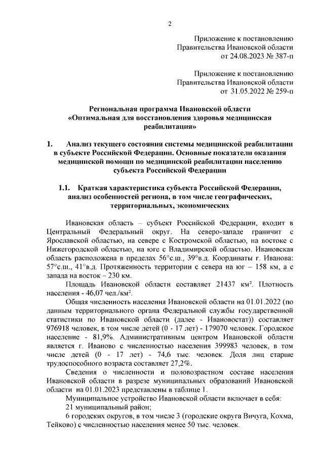 Постановление Правительства Ивановской области от 24.08.2023 N 387-п "О внесении изменения в постановление Правительства Ивановской области от 31.05.2022 N 259-п "Об утверждении Региональной программы Ивановской области "Оптимальная для восстановления здоровья медицинская реабилитация"
