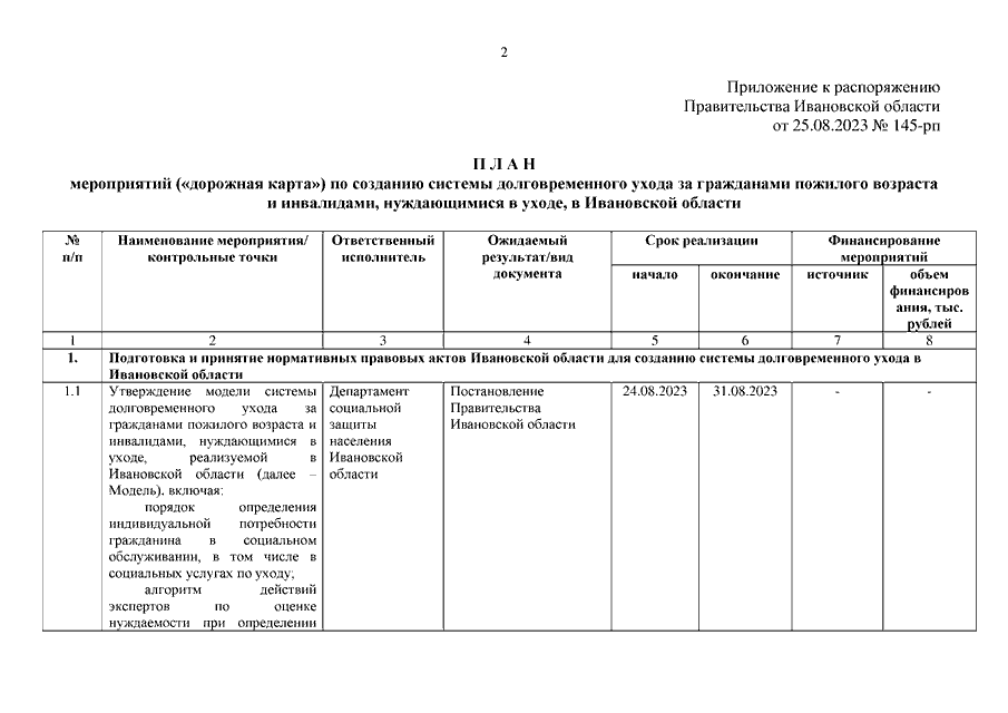 Распоряжение Правительства Ивановской области от 25.08.2023 N 145-рп "Об утверждении Плана мероприятий ("дорожной карты") по созданию системы долговременного ухода за гражданами пожилого возраста и инвалидами, нуждающимися в уходе, в Ивановской области"