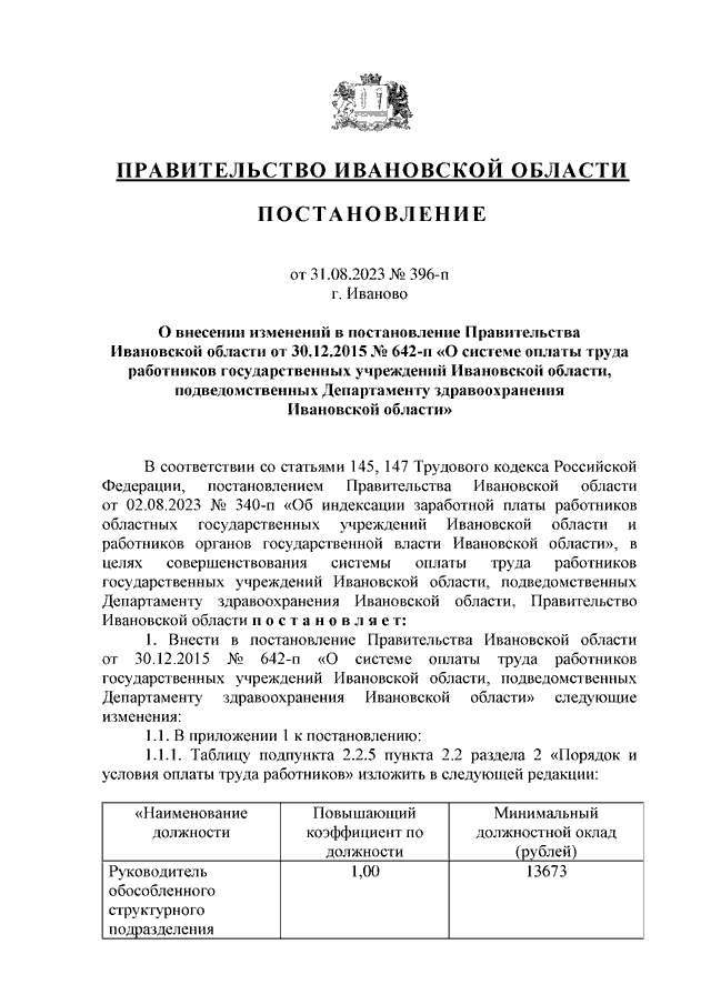 Постановление Правительства Ивановской области от 31.08.2023 N 396-п "О внесении изменений в постановление Правительства Ивановской области от 30.12.2015 N 642-п "О системе оплаты труда работников государственных учреждений Ивановской области, подведомственных Департаменту здравоохранения Ивановской области"