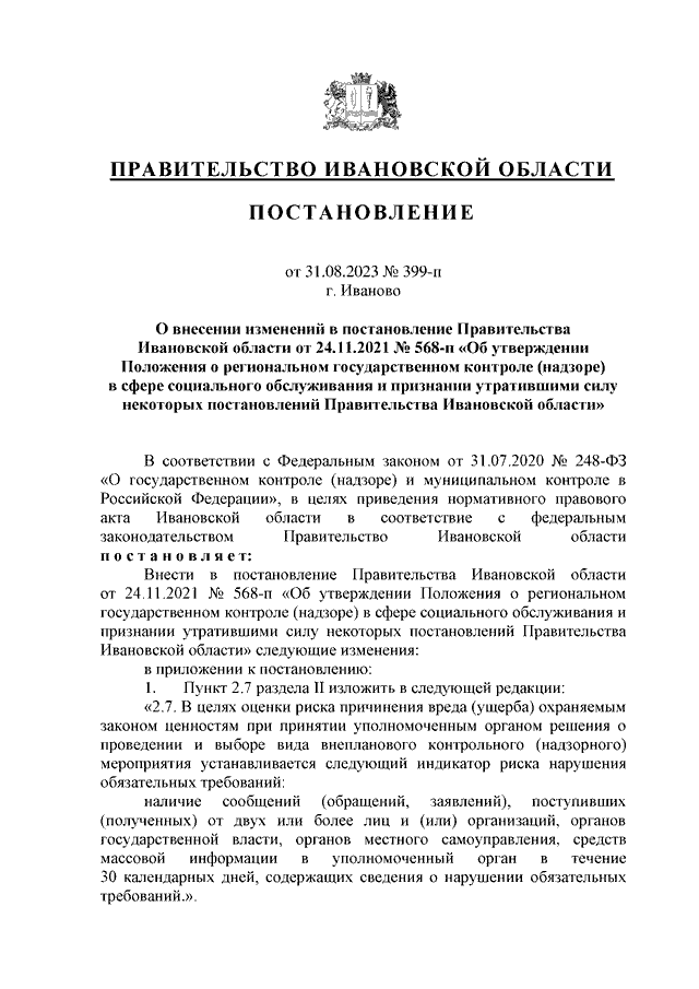 Постановление Правительства Ивановской области от 31.08.2023 N 399-п "О внесении изменений в постановление Правительства Ивановской области от 24.11.2021 N 568-п "Об утверждении Положения о региональном государственном контроле (надзоре) в сфере социального обслуживания и признании утратившими силу некоторых постановлений Правительства Ивановской области"