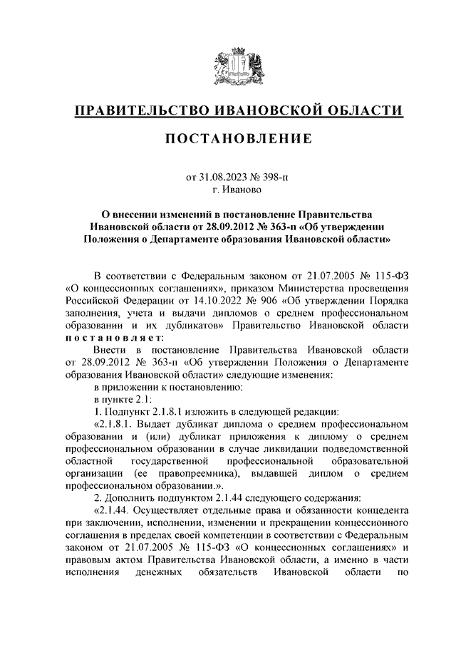 Постановление Правительства Ивановской области от 31.08.2023 N 398-п "О внесении изменений в постановление Правительства Ивановской области от 28.09.2012 N 363-п "Об утверждении Положения о Департаменте образования Ивановской области"