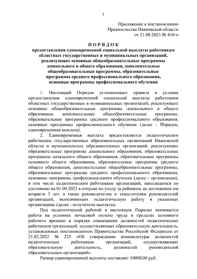 Постановление Правительства Ивановской области от 31.08.2023 N 410-п "О предоставлении единовременной социальной выплаты работникам областных государственных и муниципальных организаций, реализующих основные общеобразовательные программы дошкольного и общего образования, дополнительные общеобразовательные программы, образовательные программы среднего профессионального образования, основные программы профессионального обучения" (вместе с "Порядком предоставления единовременной социальной выплаты работникам областных государственных и муниципальных организаций, реализующих основные общеобразовательные программы дошкольного и общего образования, дополнительные общеобразовательные программы, образовательные программы среднего профессионального образования, основные программы профессионального обучения")
