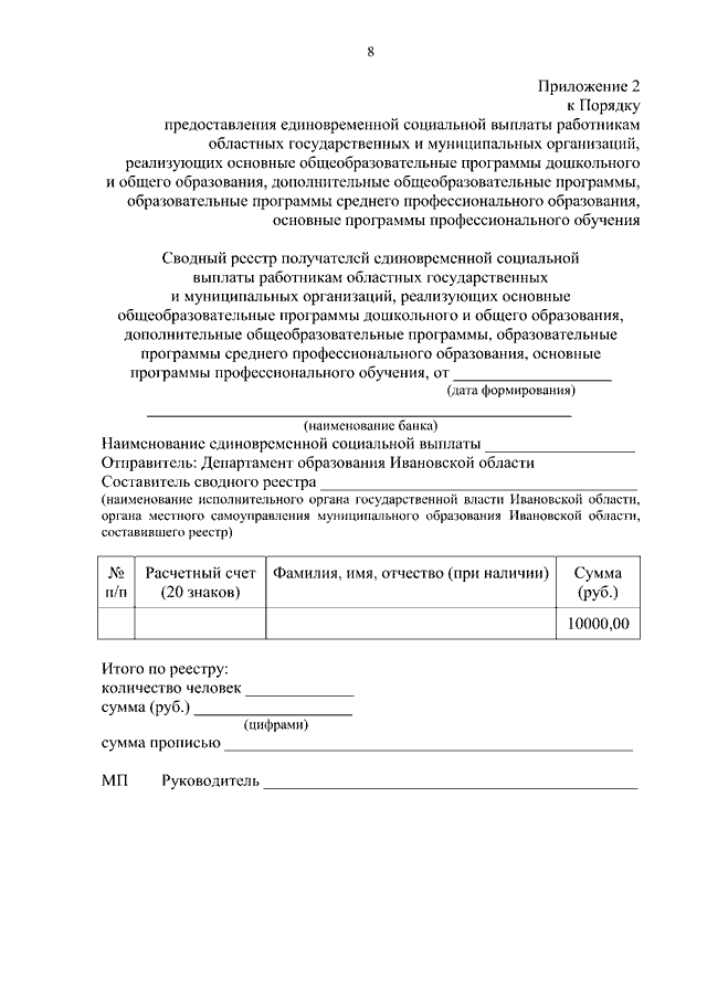 Постановление Правительства Ивановской области от 31.08.2023 N 410-п "О предоставлении единовременной социальной выплаты работникам областных государственных и муниципальных организаций, реализующих основные общеобразовательные программы дошкольного и общего образования, дополнительные общеобразовательные программы, образовательные программы среднего профессионального образования, основные программы профессионального обучения" (вместе с "Порядком предоставления единовременной социальной выплаты работникам областных государственных и муниципальных организаций, реализующих основные общеобразовательные программы дошкольного и общего образования, дополнительные общеобразовательные программы, образовательные программы среднего профессионального образования, основные программы профессионального обучения")