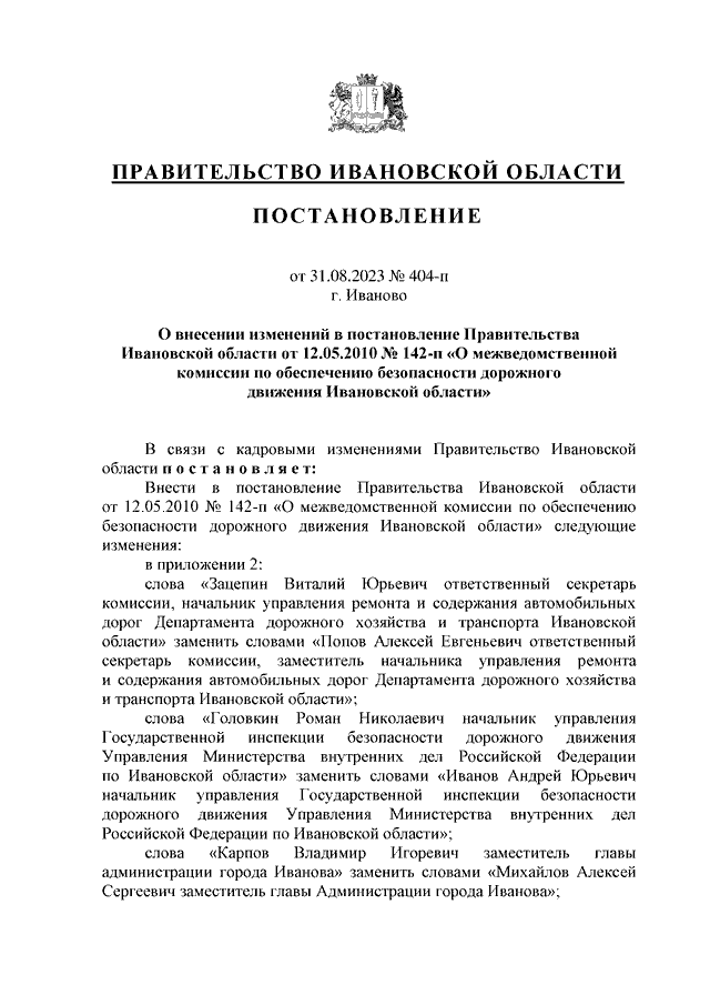 Постановление Правительства Ивановской области от 31.08.2023 N 404-п "О внесении изменений в постановление Правительства Ивановской области от 12.05.2010 N 142-п "О межведомственной комиссии по обеспечению безопасности дорожного движения Ивановской области"