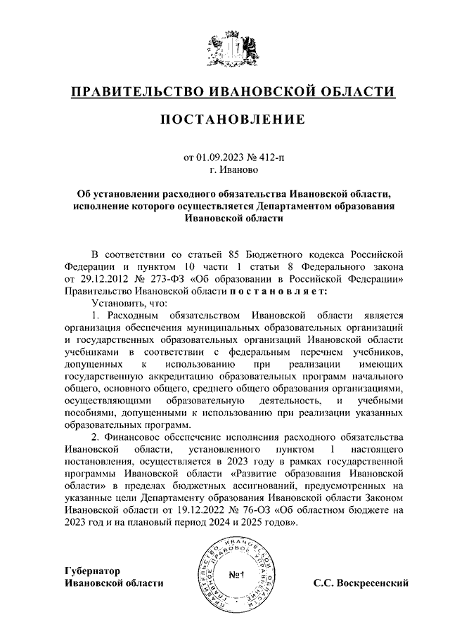 Постановление Правительства Ивановской области от 01.09.2023 N 412-п "Об установлении расходного обязательства Ивановской области, исполнение которого осуществляется Департаментом образования Ивановской области"