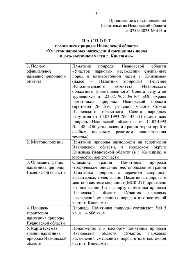 Постановление Правительства Ивановской области от 07.09.2023 N 415-п "О памятнике природы Ивановской области "Участок парковых насаждений смешанных пород в юго-восточной части г. Кинешмы" (вместе с "Паспортом памятника природы Ивановской области "Участок парковых насаждений смешанных пород в юго-восточной части г. Кинешмы")