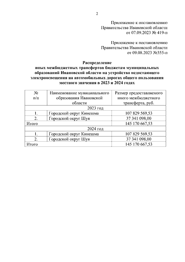 Постановление Правительства Ивановской области от 07.09.2023 N 419-п "О внесении изменений в постановление Правительства Ивановской области от 09.08.2023 N 355-п "О распределении иных межбюджетных трансфертов бюджетам муниципальных образований Ивановской области на устройство недостающего электроосвещения на автомобильных дорогах общего пользования местного значения в 2023 году"