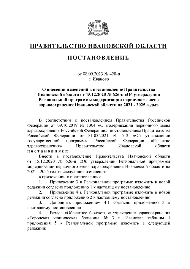 Постановление Правительства Ивановской области от 08.09.2023 N 420-п "О внесении изменений в постановление Правительства Ивановской области от 15.12.2020 N 626-п "Об утверждении Региональной программы модернизации первичного звена здравоохранения Ивановской области на 2021 - 2025 годы"